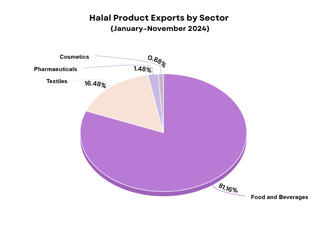 Indonesia’s halal export sector has shown steady growth over the past six years, increasing by 1.7% in 2024. The food and beverage sector dominates halal exports, contributing 81.16% of total exports. Textile products make up 16.48%, while pharmaceuticals and cosmetics account for 1.48% and 0.88% respectively. These figures highlight that Indonesia’s halal export strength is rooted primarily in everyday consumer goods–particularly food