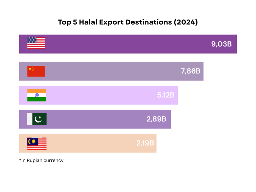 Indonesia’s halal products continue to expand into major international markets, with the United States, China, India, Pakistan, and Malaysia among the largest destinations. Key exports include animal and vegetable oils, seafood, and cocoa-based products. Indonesia has strengthened its global position through various international partnerships and regulatory cooperation agreements, such as the Ministry of Industry’s (Kemenperin) partnership with China’s Food and Drug Corporation Quality and Safety Promotion Association (FDSA), which supports halal supply chain, and regulatory alignment between Indonesia’s BPOM and China’s National Medical Products Administration (NMPA)